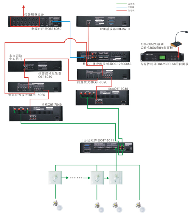 公共廣播系統分區按建筑消防分區要求將消防廣播分為多個消防廣播分區,背景音樂廣播與消防應急廣播的音源、功率放大器、揚聲器等設備共用一套,功能分開使用,合用一個線路系統,系統平時需要播放業務廣播時,可切斷背景音樂;發生火災時,與大樓消防報警系統聯動,構成緊急廣播系統,實現火災和緊急事故的廣播,實現資源共享,最大限度的節約資源,同時在第一時間避免人員傷亡和財產損失,保障廣場內一切安全。